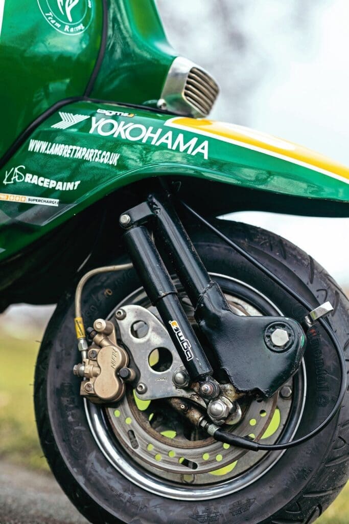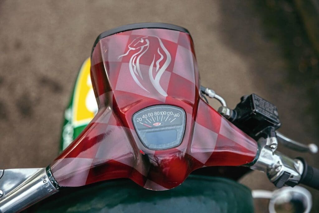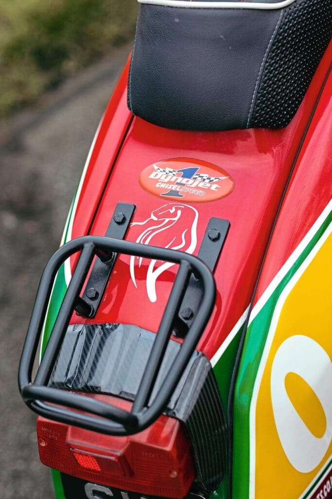 Having developed an understanding of the scooter’s provenance, John wanted to keep it as close to its original condition as possible. However, technology has moved on rapidly over the past few years and he wanted to incorporate modern upgrades. With that in mind the scooter now runs on a TS1 225 kit with a 58×107 race-crank, fuel is supplied through a 30mm Dell’ Orto carb, the gearbox is a GP200 unit fitted with a four-plate easy-clutch and all of that is supported by a JL exhaust.
