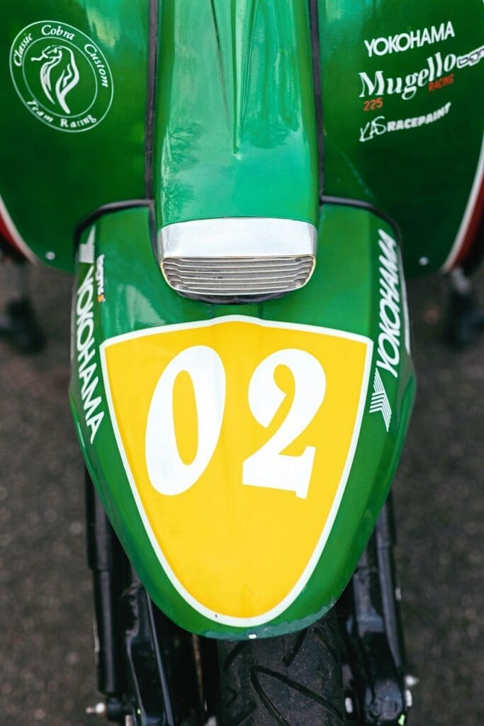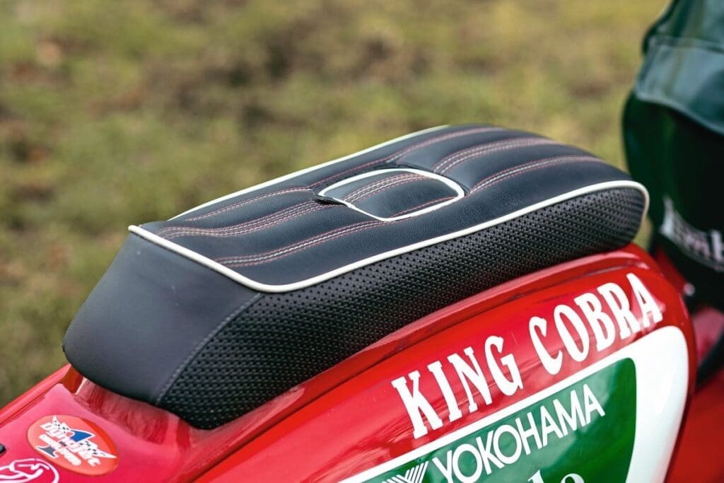 Fitted as standard to both Cobras was a choice of an Italian-style standard GP headset or drops, long-range stainless-steel petrol tank, rear mudguard, flywheel cowl, cylinder cowl and wheel rims, polished billeted front hydraulic disc brake, kick-start, brake pedal, race-style seat and Yokohama tyres. On all the models, the side panel grilles and frame-loop toolbox lid were filled, and there was often a distinctive double circular rear light set-up.