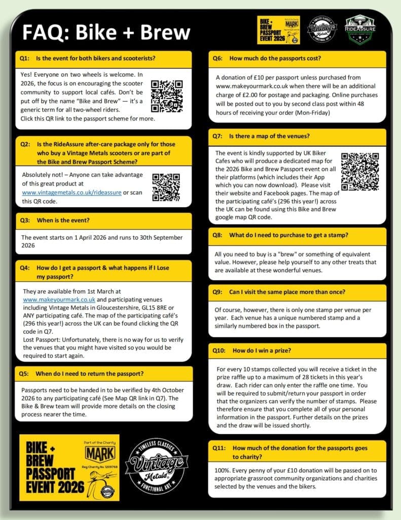 The Bike & Brew Passport encourages exploration by guiding riders to over 250 participating biker-friendly cafés across Wales, the West Midlands, the Cotswolds and beyond. Riders collect stamps as they visit venues, turning the passport into a record of journeys taken, places discovered and connections made. The Passport runs from April 1 to September 30, 2026, costs £10 as a charitable donation, and can be collected from all participating cafés — including Vintage Metals’ Piston Grind Café, as well as www.makeyourmark.co.uk. The map of the participating café’s (296 this year!) across the UK can be found using the Bike and Brew google map link which can he be found here.