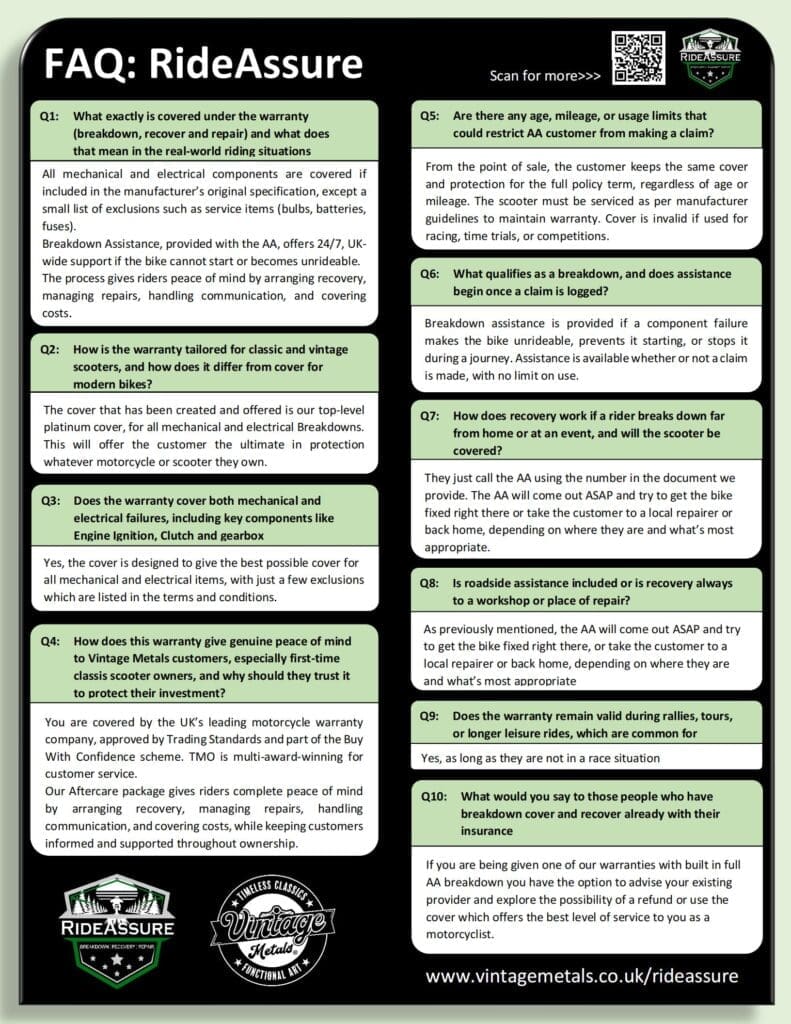 Vintage Metals has also introduced RideAssure, a competitively priced breakdown, recovery, AND repair after-care product BUT this is no ordinary after product. Three years running, the winner of “The Motor Ombudsman customer service awards” is fully backed by an AA breakdown service, which is competent in 2-wheeler mechanics. RideAssure covers UK and European breakdown, roadside recovery and repairs, parts and labour, and wear-and-tear protection up to 60,000 miles for any age vehicle, supported by fast claims and a nationwide garage network and home start support. Bike & Brew passport holders also receive £50 off RideAssure, redeemable via a QR code inside the passport. More information can be found at: www.vintagemetals.co.uk/rideassure