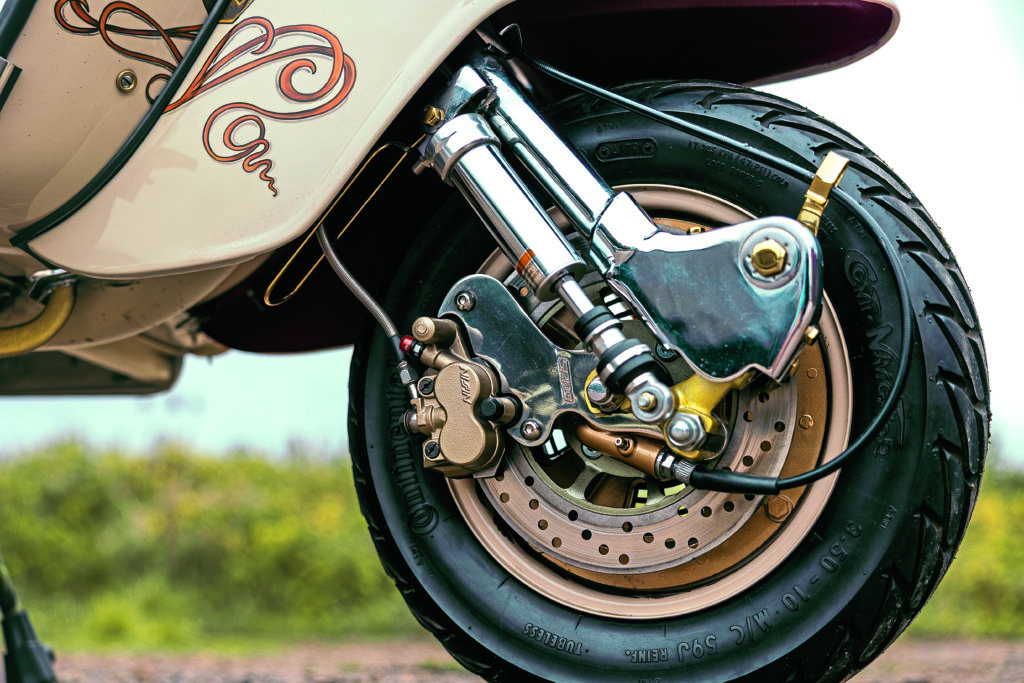 For all its artistry, Reach Out I’ll Be There isn’t just a showpiece; beneath the cut-away side panels beats an engine built for performance. Power comes from an RT 225cc kit, built for torque and reliable two-up riding, feeding it is a 28mm Dellorto carb, and everything completes through to a KRP Road Curly exhaust. Whether Sophia’s using the scooter for solo riding or Isabelle’s riding pillion, the engine delivers strong, responsive acceleration with enough flexibility to handle long rides or city traffic without complaint.